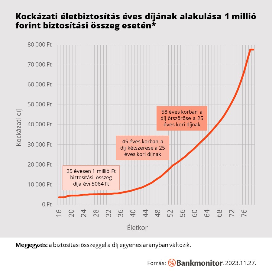 Az alábbi grafikon 1 millió forint biztosítási összegre számított egy éves kockázati díjat mutatja a különböző életkorokban. Ha a biztosítási összegnek megfelelőan arányosítod az itt kiszámított díjat, már meg is kapod, hogy mennyit kell fizetned. 25 éves korban az egymillió forint biztosítási összeghez tartozó díj 5064 forint, ez 10 millió forint biztosítási összeg esetén 50 640 forint éves díjat jelent.